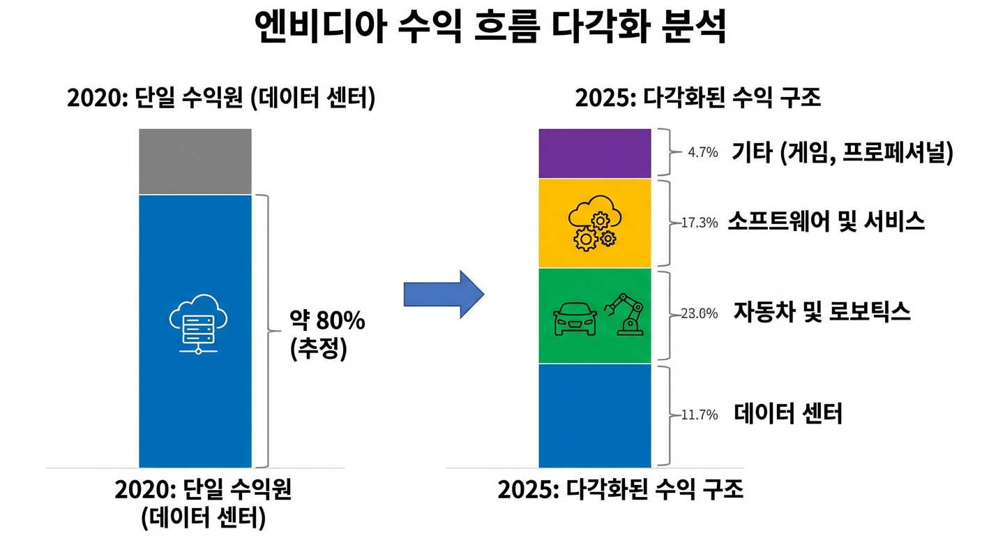 A. 데이터센터에 비해 매출 규모는 작지만, '성장률' 측면에서 중요합니다. 데이터센터 성장이 둔화될 때 자동차 부문이 50% 이상 고성장한다면 밸류에이션 하락을 막는 핵심 지지대가 됩니다.
